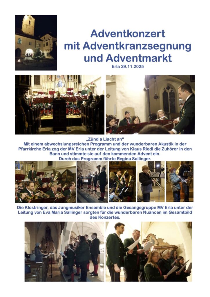 Mit einem abwechslungsreichen Programm und der wunderbaren Akustik in der Pfarrkirche Erla zog der MV Erla unter der Leitung von Klaus Riedl die Zuhörer in den Bann und stimmte sie auf den kommenden Advent ein.